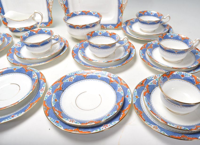 A Fine Bone China English tea service by Kildare Fenton China having blue ground rims with orange pattern decoration. The service compressing of nine cups, saucers and side plates, milk jug / creamer, sugar bowl and two cake plates. With spares.