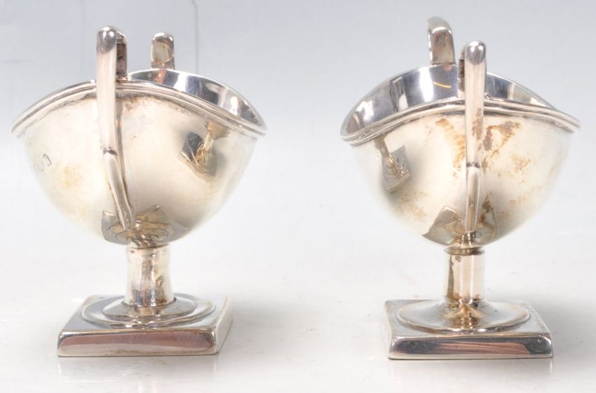 A pair of silver hallmarked salt cellars having twin square handles raised on square plinth bases (filled). Hallmarked Chester 1896. Weight 100g.