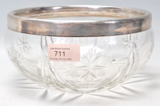 An early 20th Century cut glass centrepiece bowl having an English hallmarked collar. Hallmarked Birmingham 1927, makers marks for Sanders & Mckenzie. Measures 21 cm diameter.