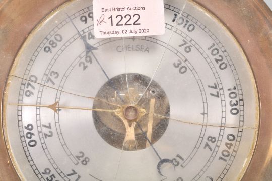 A good vintage 20th Century brass bulkhead clock having a brass face with Arabic numeral chapter ring with seconds dial marked 'Chelsea'. Together with a bulkhead brometer marked for Chelsea. Biggest measures 19cm diameter by 9cm deep.