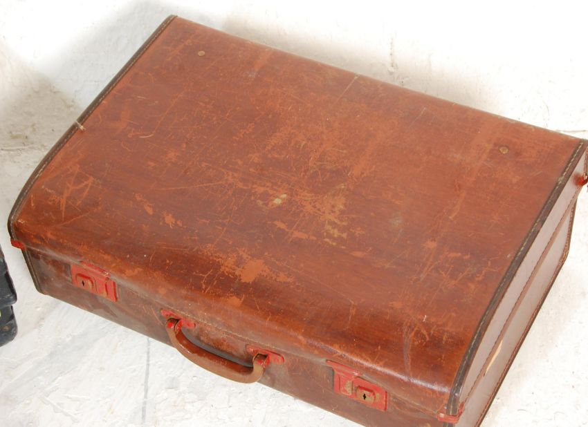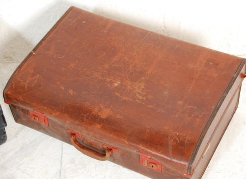 Two vintage retro mid 20th Century leather cased travelling suitcases / trunks to include a faux black leather example complete with retro shipping labels and J. P. A. initials and a brown leather case. Measures 19x66x40cm.