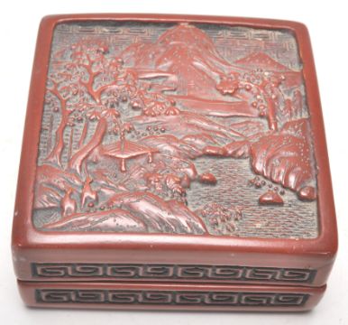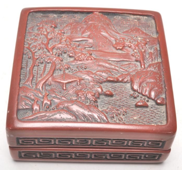 A vintage 20th Century carved Japanese cinnabar box having a mountainous scene to the lid together with a Japanese carved bone puzzle box, opening to reveal carved pieces within and a wooden stamp box.