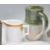 A mixed group of Studio Art pottery ceramics with a brown glazed L shaped vase with two sections bearing Ls mark to base, two tone jug, two cylindrical brown glazed vase one bearing Ls mark to base, centerpiece bowl having a light blue glazed center. Together with a Royal Copenhagen white ceramic jug with gilt decoration and a retro signed clear glass dish.