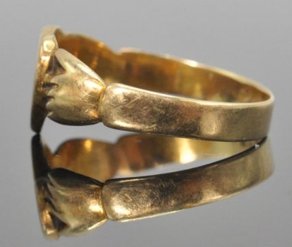 A Victorian 19th century 15ct / 625 hallmarked gold and diamond Irish claddagh ring. The ring with heart centre having inset diamond and hands either side representing love and friendship. Birmingham hallmarked for 1893. Total weight 1.89g