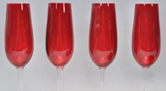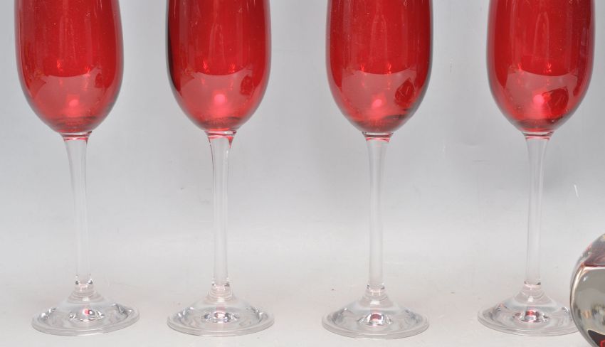 A matching group of four retro champagne flutes having red glass bowls and clear stems. Together with a red glass wine glass and retro ashtray and a vintage blue glazed twin handle vase decorated in relief with cherubs and foliate detailing. Impressed marks to base.