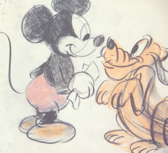 A good vintage pencil drawing sketch print of Disney Mickey Mouse and Pluto entitled 'Pluto's Purchase'. Framed and glazed. Measures 35cm tall by 46cm wide.