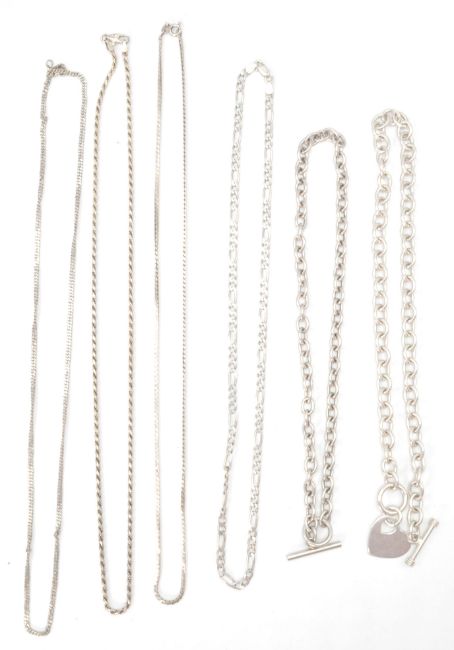 A group of six silver necklace chains to include a flatlink example having a lobster claw clasp and being stamped 925, a heavy hallmarked necklace having a heart pendant and T-Bar clasp bearing hallmarks and another having a T-Bar clasp etc. Total weight 100g. Longest measures 23 inches long.