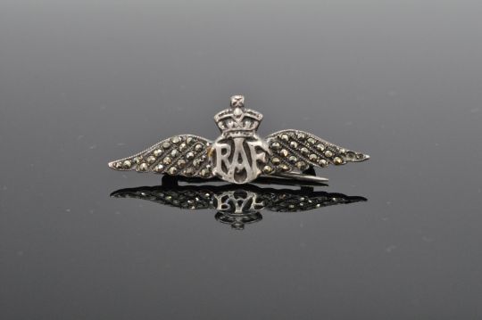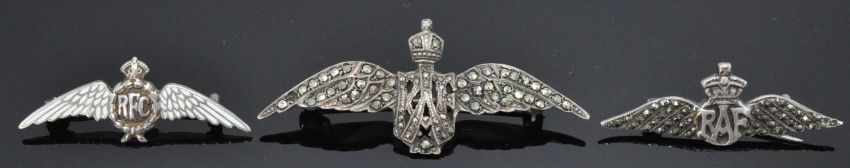 A group of three silver RAF brooches to include one with white enamelled wings (hallmarked Birmingham 1915), and two later 1930's brooches set with marcasites. Both marked silver. Total weight 12.5g. Laregest brooch measures 5.5cm wide.