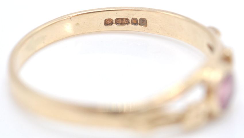 A hallmarked 9ct gold and ruby ring. The central mixed cut ruby in a pierced flower setting. Hallmarked for London, Sponsors mark AC GG. Total weight 1.28g