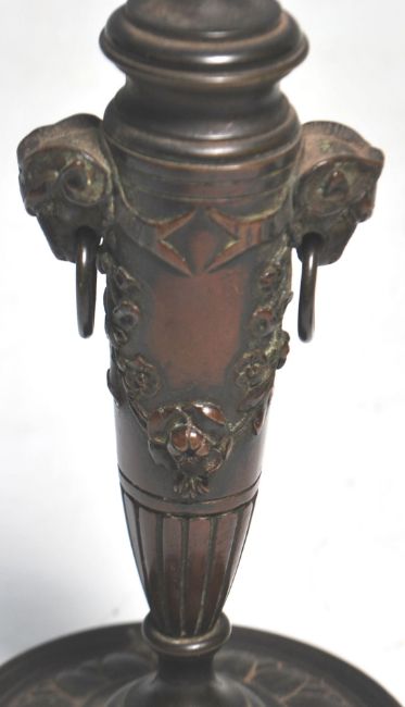 A pair of 19th Century cast bronze Grand Tour candlesticks having reeded cylindrical scones on tapering urn form columns with rams mask ring handles and floral garland decoration, raised on round bases. Measures 12 x 10 cm.