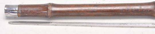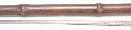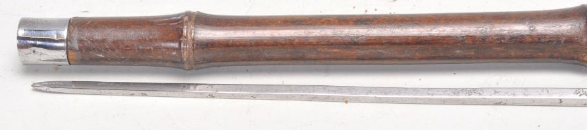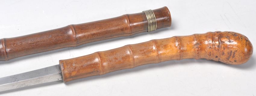 A vintage 20th Century bamboo sword stick / walking stick cane of slim form having a root knot ball knob to top. Measures 91cm long.