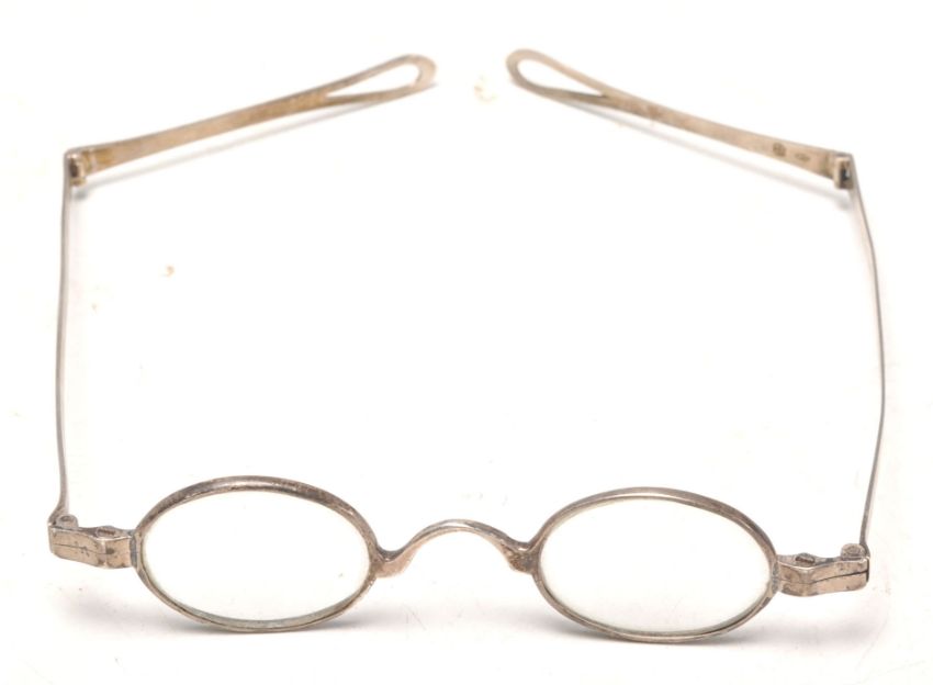 A pair of early 19th Century Georgian silver folding spectacle wig glasses. Fully hallmarked with makers J.W. Weighs 23 grams.