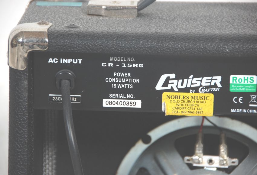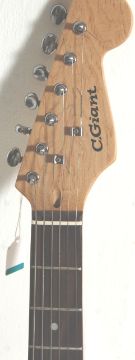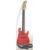 A children's Encore electric guitar having a black body with marked fret board and chrome tuning pegs. Together with a Cruiser CR 15RG amplifier and boxed Fender Amp Stand and a A C. Giants children's Fender Stratocaster style six string electric guitar having a red finished body and marked fretboard.