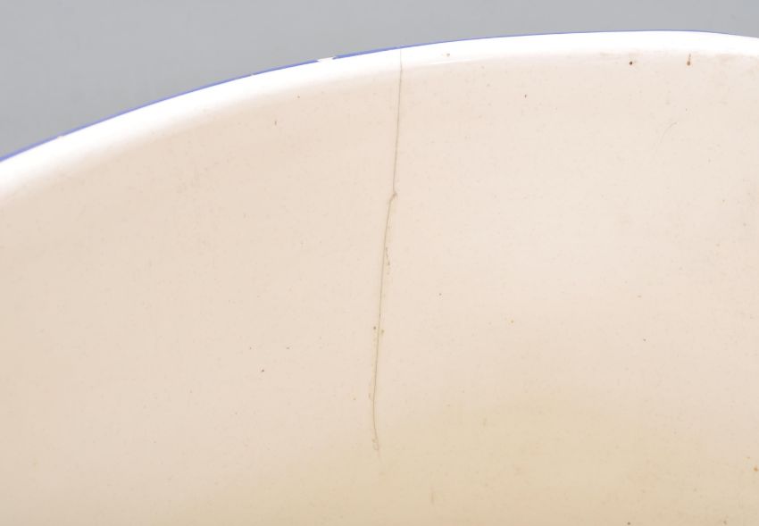 An antique 19th century Victorian Copeland Spode made ceramic footbath. Decorated with florals to the body, with a blue painted flared edge and decoration to the twin handles. Impressed ' Spode ' mark to base. Measures approx 49cm diameter.