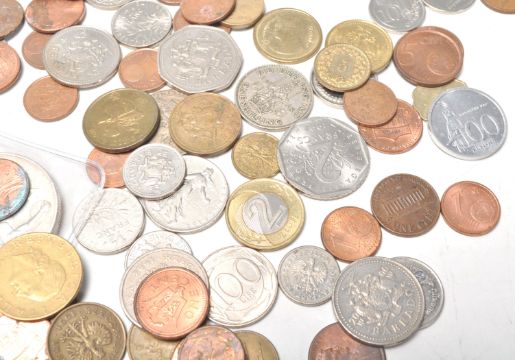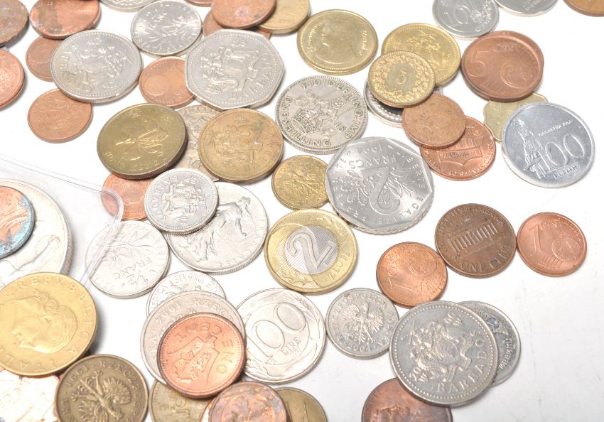 A mixed group of world coinage with some silver example coins. Coins include Republica De Panama 5 Balboas, English coinage, Amircan examples etc.