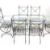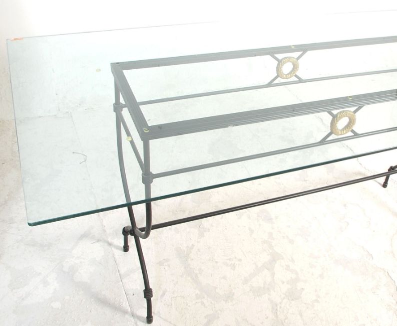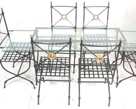 A contemporary bespoke glass topped table by "Ironart of Bath" set upon a wrought iron scrollwork x-frame base with 2 carvers and 4 standard dining chairs all decorated with a wreath motif. All chairs come with cushions.