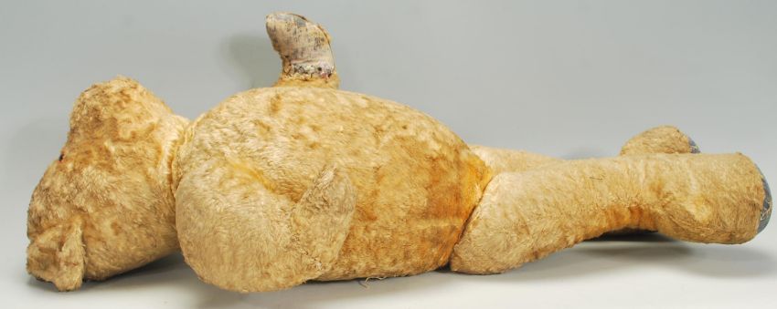 A vintage early to mid 20th Century childs teddy bear constructed from mohair with leather patches to the paws and feet.
