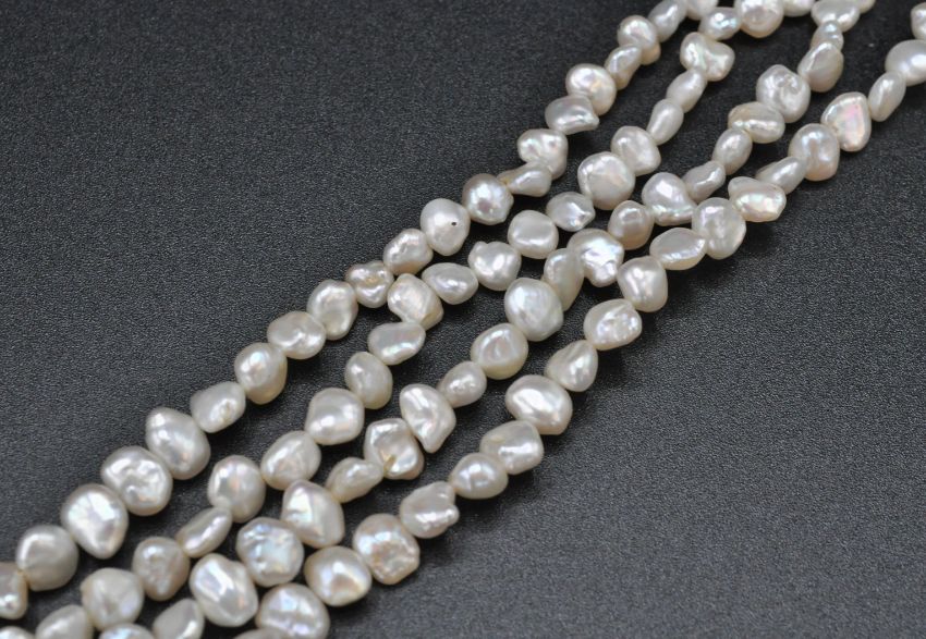 A 14ct white gold 585 4 strand baroque pearl bracelet by JKA . The bracelet united by a 14ct gold clasp with inset round mixed cut blue stones in a , Total weight 22.57g / Size 18cm