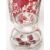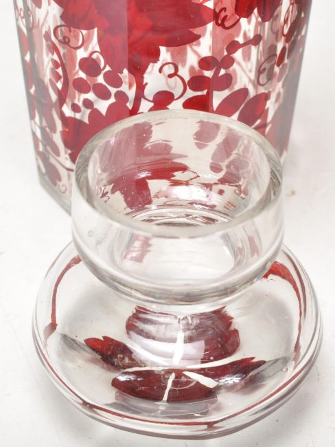 A group of early 20th Century antique bohemian ruby glass to include a bottle decanter having a knopped neck and stopper with etched grape vine decoration throughout, together with two similar glass jars having faceted sides and cut glass lids. Measures 27cm tall.