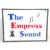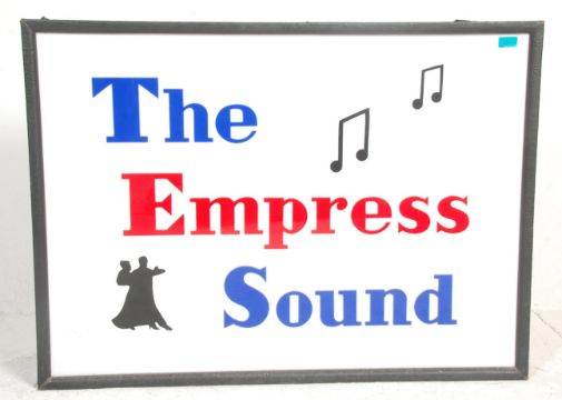 A shop advertising display light box having applied blue and red lettering reading 'The Empress Sound' in a black faux leather case.