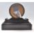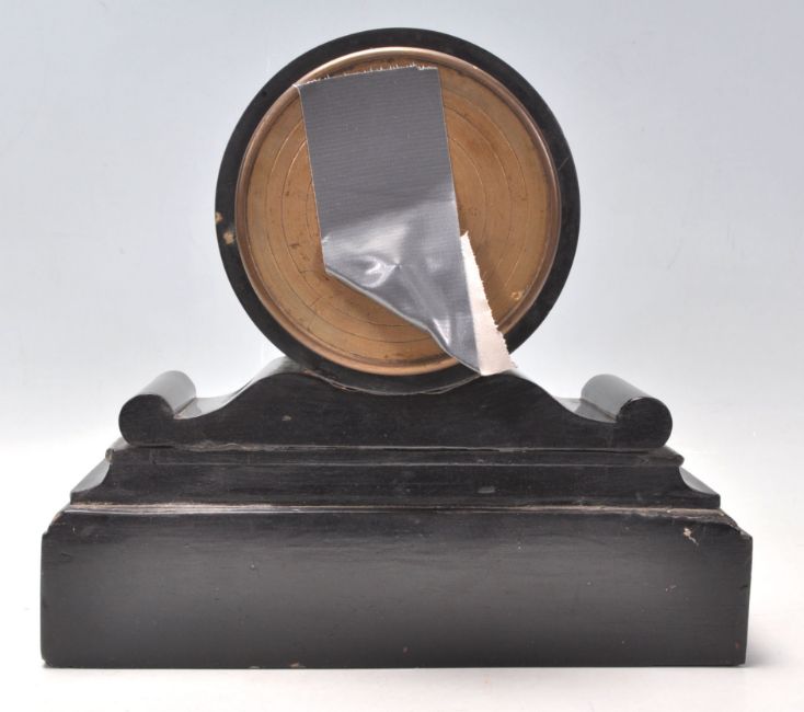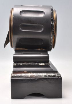 A late 19th Century black marble barrel mantel clock having a plinth base with round clock mounted to the top flanked by scrolled arms to either side of the clock, having a white enamelled face with roman numerals to the chapter ring.