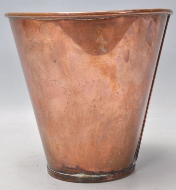 A vintage copper ice bucket of tapering form having a banded rim. Measures 19cm tall with a diameter of 18.5cm on the top and 10.5cm on the base