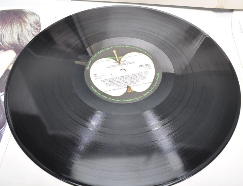 A vinyl long play LP record album by The Beatles – White Album ( Sleeve Number 0396894 )– Original E.M.I Apple label 1st U.K. Press – PMC 7067 Stereo –  Vinyl condition VG. Gatefold sleeve condition VG. Top opening sleeve having original lyric poster and four photos.