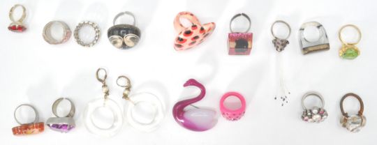A collection of retro costume jewellery rings of plastic, composite and white metal construction. To include a bug eye ring, mushroom ring with fibre trails, plastic heart flower, aventurine fleck, glitter and star set, pink plastic, glass heart set, large heart, white metal and pearl, pink glass heart, red glass heart, white plastic doughnut earrings etc.