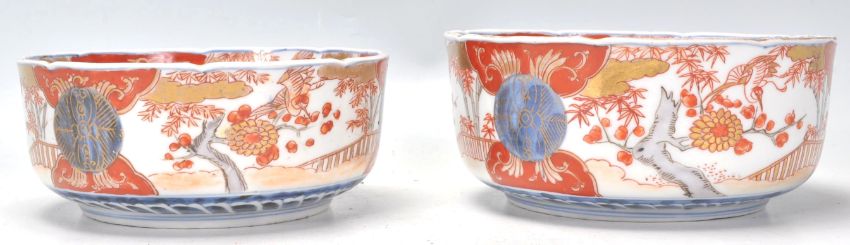 A pair of early 20th Century Chinese ceramic Imari pattern bowls with single blue ring marks to bases. One bowl being larger then the other. Measures 17cm diameter.