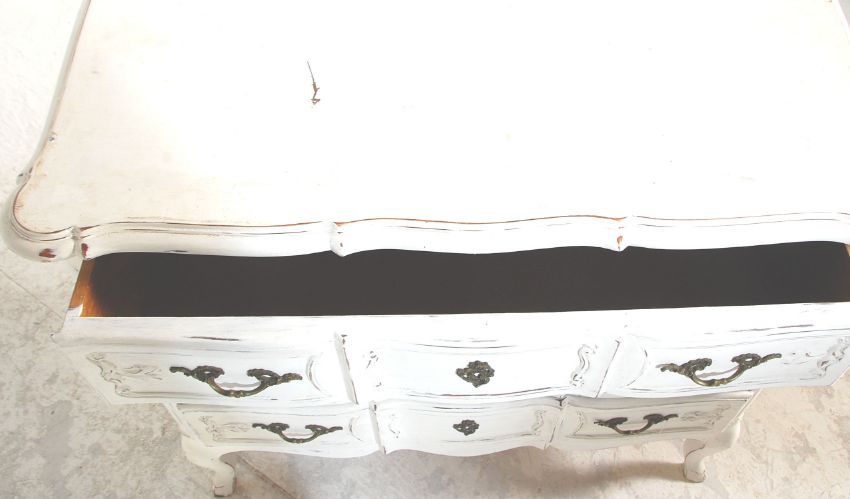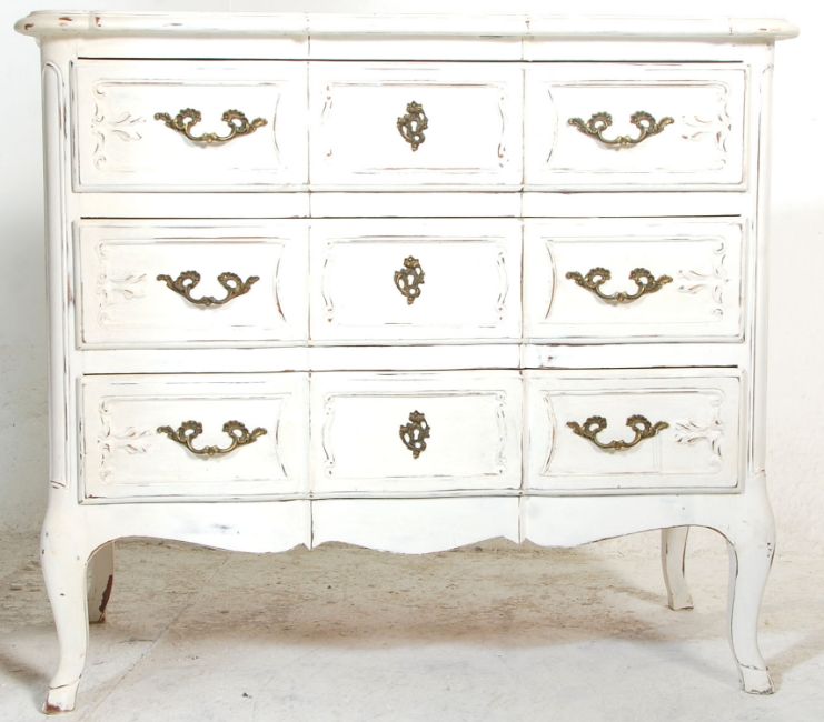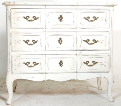 A 19th Century French white painted wood Louis XV style commode - chest of drawers having three panelled drawers with carved leaf decoration with scrolled metal handles and decorative lock covers raised on cabriole legs. Measures Measures 82x92x46cm.