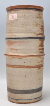 ROBIN WELCH (1936-2019) - A large retro studio art pottery stoneware cylindrical vessel / vase decorated with polychrome earth tone glazes with ridged decoration to the centre. Signed Robin Welch to the base. Measures 36cm tall.