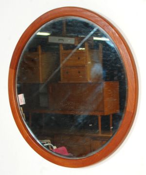 A vintage retro mid 20th Century circular teak framed hanging wall mirror having a bevelled edge mirrored panel. Measures 56cm diameter.