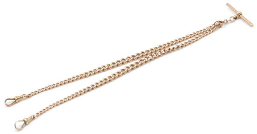 A Victorian 9ct gold albert chain necklace. Complete with t-bar and twin swivel clasp ends. Total weight 31.62g / Length 37cms.