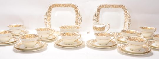 Crescent China - A Fine Bone China English part tea service by George Jones for Crescent China having gilt floral decoration. The service comprising twn cups, ten saucers and ten side plates (ten trios) with some spares, milk jug, sugar bowl and two sandwich plates. All bearing marks to the bases.