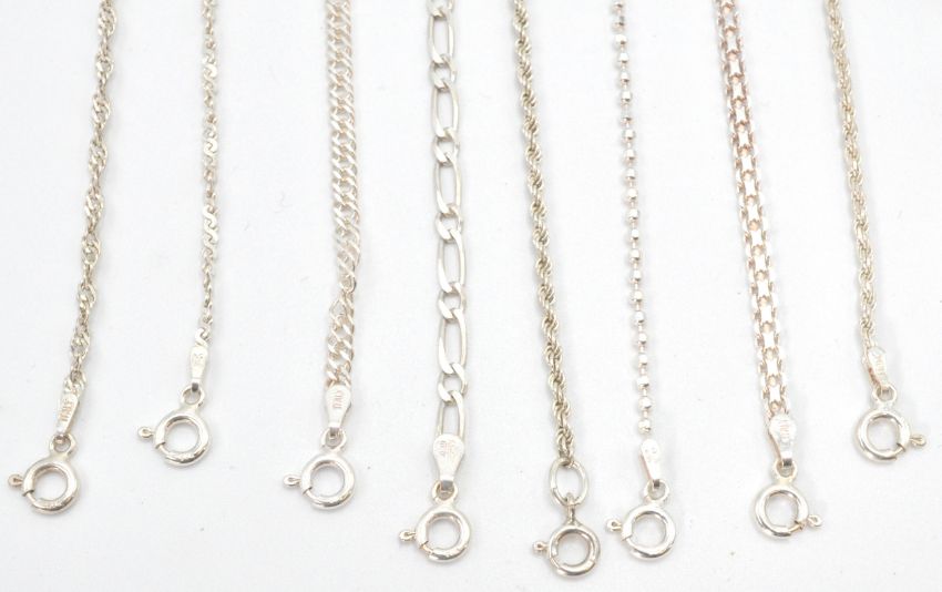 A collection of silver chains and bracelets to include  flat link, bar link CZ set, omega linked chains along with  a silver ring and a collection of silver earrings of various design. Total weight 44.4g