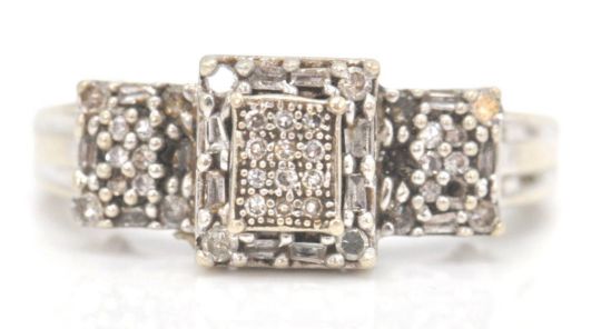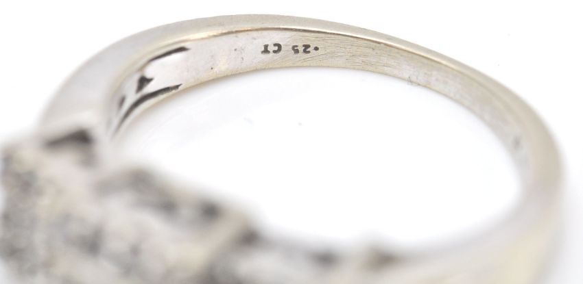A 9ct white gold and diamond Art Deco cluster ring. The ring with pave set diamonds in prong mounts. The shank stamped 9k. Estimated diamond weight 0.25cts. Total weight 3.7g