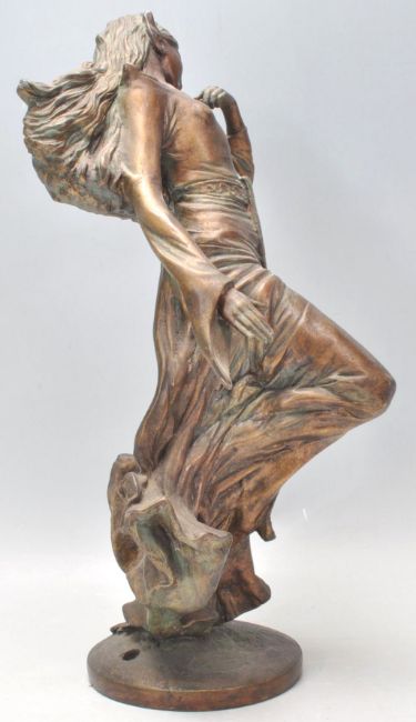 A 20th century antique style bronze effect resin she elf  / nypmh figure signed to the base Michael Steel Mark Turner. Measures 36cm tall.