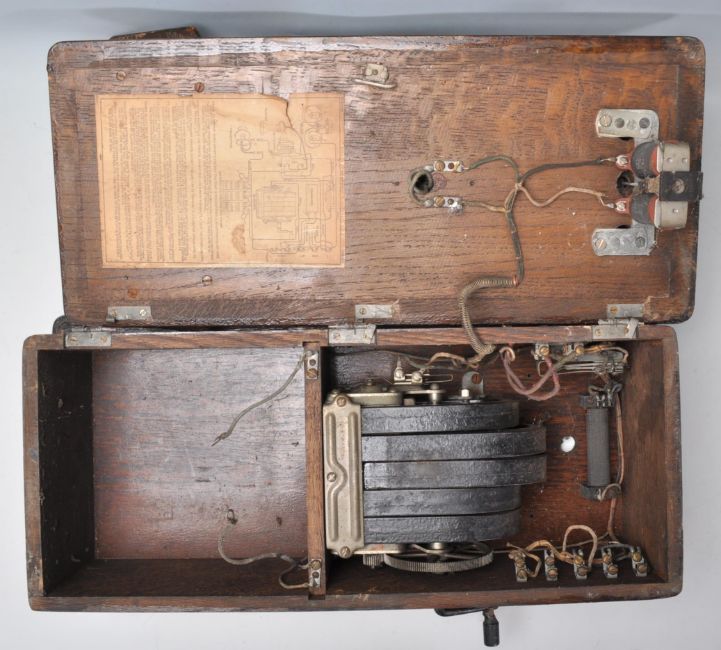 An early 20th Century wall mounted telephone being oak cased with Bakelite mouth and earpiece.