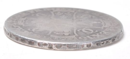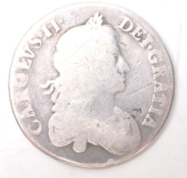 A 17th Century Charles II silver crown coin with a rubbed date (168?), poor condition. Weight 28.7g. Measures 38mm.