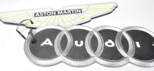 A collection of four 20th Century vintage style cast iron classic sports car related shop display / point of sale wall plaques to include the Lamborghini badge set on a black armorial crest featuring the iconic golden bull, the Maserati emblem featuring a red trident on a white background, the Audi featuring four silver rings on a black background and an Aston Martin wing shaped plaque.