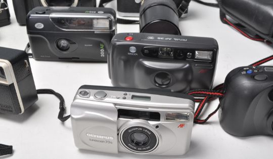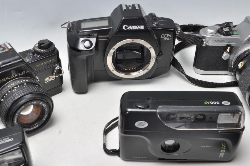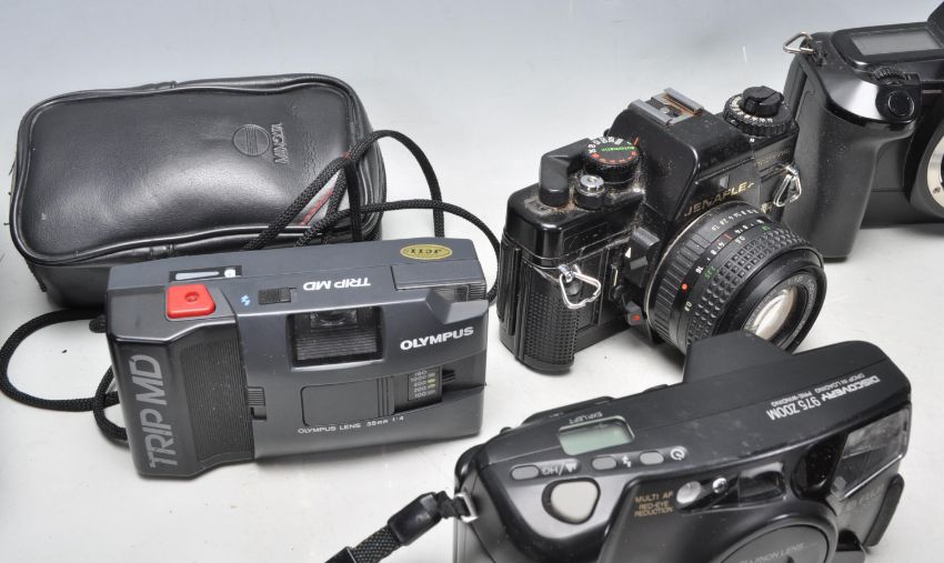 A collection of vintage cameras to include a Pentax MG camera with lens, Fuji Discovery 975, Canon Sureshot AF7, Yashica Zoomate 70, Minolta Riva AF35, Minolta Vectis 2000, Praktica Panorama CM1000, Jenaflex Electronic, Canon EOS 650, Boots 300AF, Olympus Trip MD, Olympus Superzoom 70G, Kodak Instamatic 55X and a Minolta Vectis 260.