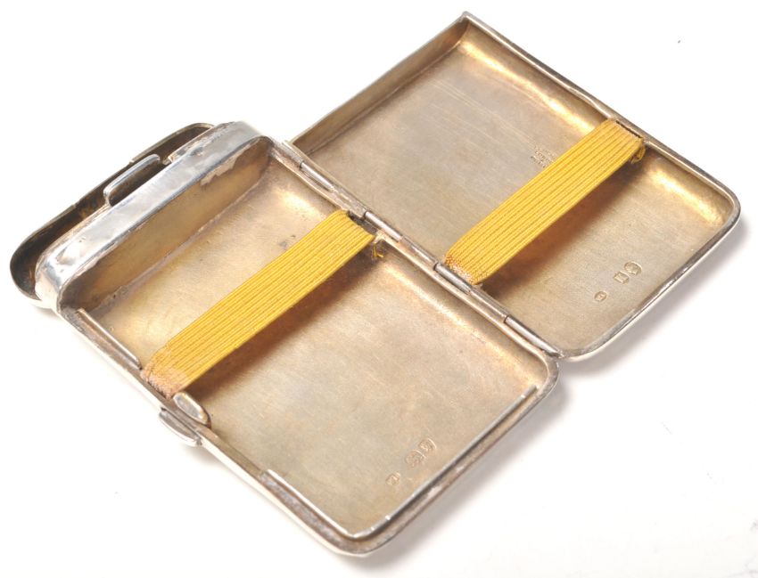 A 19th Century Victorian silver hallmarked cigarette case of rectangular form engraved with a sheep holding a flag crest, having a hinged opening to the top revealing a match striker within. Hallmarked London 1885, with makers marks for William Leuchars. Weight 78g.