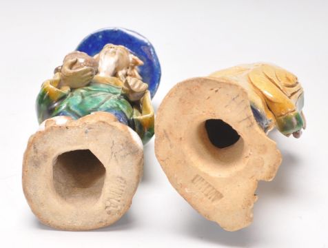 A pair of 1920's Chinese export Ming Dynasty style ceramic figurines in the form of two men glazed in yellow blue and green, both bearing objects. Stamped China to the bases.