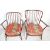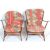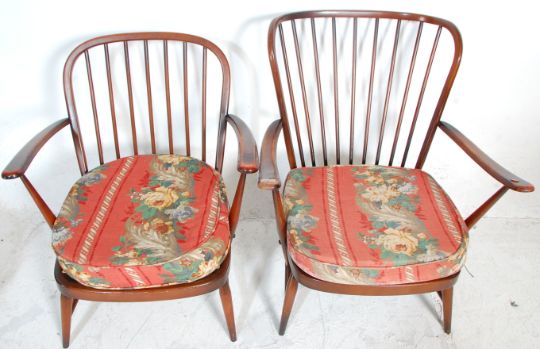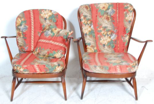 Two vintage retro 20th Century Ercol dark elm stick back open arm lounge chairs one having a round back and the other square, raised on turned tapering legs united by H stretchers, each with red floral upholstered seat cushions.