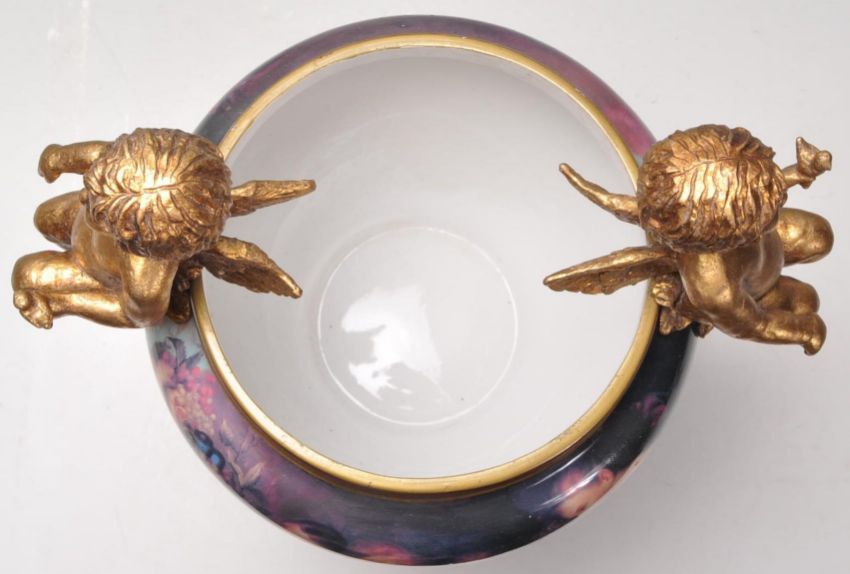 A 20th Century German porcelain jardiniere planter having gilt Maltese dolphin supports with shell decoration and gilt winged cherubs atop. The planter its self having transfer printed scene depicting cherubs. German marks to base. Measures 37cm tall by 30cm wide.