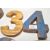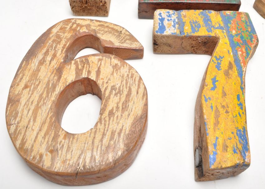 A set of vintage retro wooden signage numbers each having weathered different coloured paintwork including numbers 1,2,3,4,5,6,7,8,9,0.