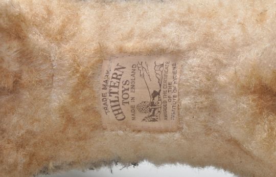 A vintage 20th Century Chiltern made push / ride along dog fixed to a tubular red painted metal trolley frame. Label to underside. Measures 18.5 x 19.5 x 14.5 cm