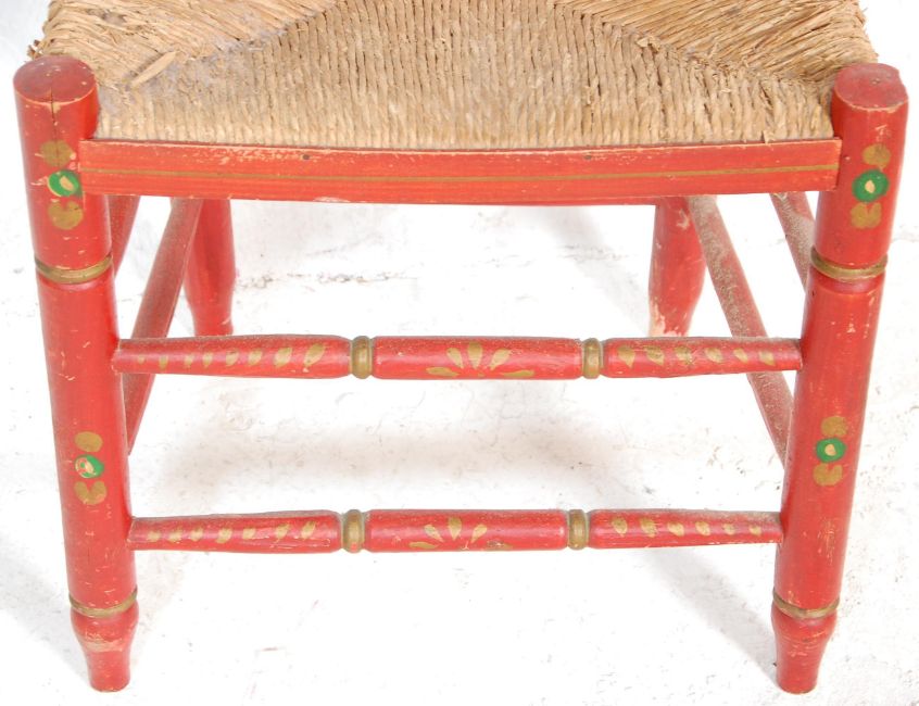 A folk Art / Barge Ware type low chair having a rush seat finished in red with floral and gilt decoration. Raised on cylindrical supports united by stretchers. Measures 90x42x35cm.