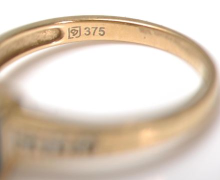 A stamped 375 9ct gold ladies dress ring set with a rectangular cut blue stone with three accent stones to the shoulders. Weight 2.3g. Size N.5.