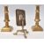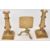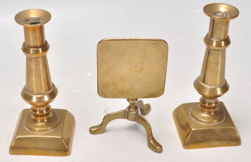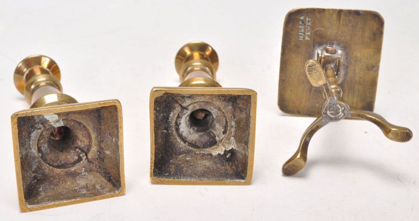 A Victorian 19th century apprentice piece tilt top brass table stamped for Mills & Newey together with a set of 19th century brass candlesticks being raised on squared bases with tapering columns and single sconces with flat flanged rims. Tallest measures 10cm.